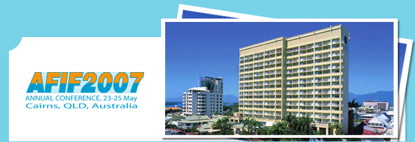 Register for the AFIF Conference NOW (before the 5 May) to save money on your registration fee. You can save $100 by registering NOW! Log onto www.afif.asn.au/afifconference to be able to see the full program and register on line, or contact the conference secretariat on afifconference@willorganise.com.au to obtain a copy of the registration brochure. ACCOMMODATION